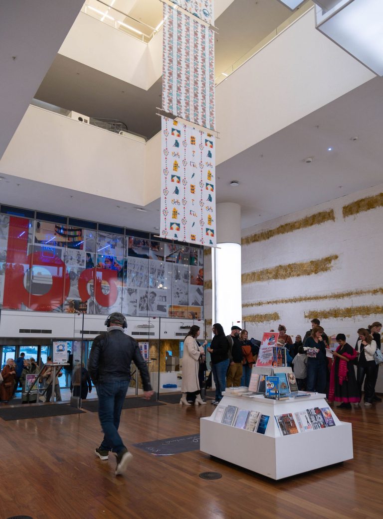 Op 24 oktober presenteerden we in de OBA Amsterdam het bijzondere project Blockprint Dialogues: Een acht meter lang wandkleed dat de verbinding tussen generaties en culturen laat zien.